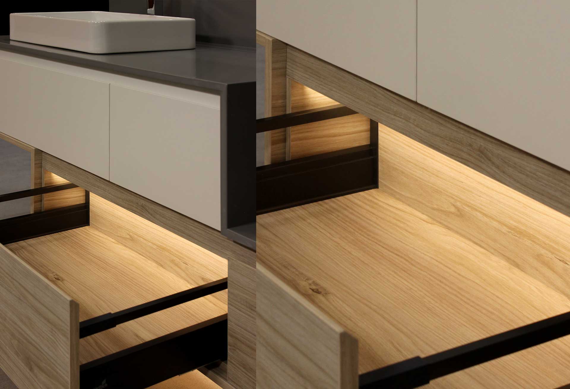 Lineare es lineal. Surge de un frente para muebles de baño, caracterizado por la apertura mediante ranura, forma líneas rectas, creando detalles de diseño con armonía. El frente lineare se fabrica con un chaflán en la parte superior o inferior, perfilada a 45º, sistema de extracción y cierre manual desde cualquier punto, un mecanismo sobrio, sencillo, y funcional.